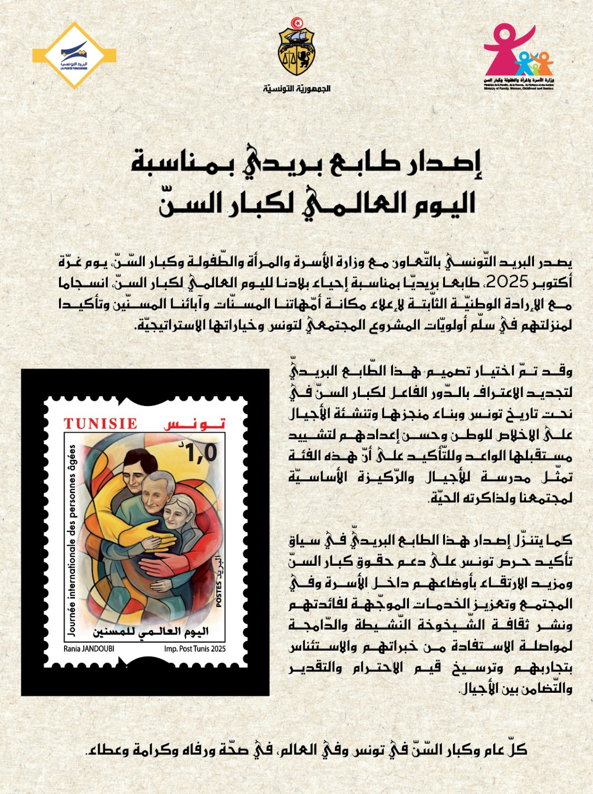 يصدر البريد التّونسي بالتّعاون مع وزارة الأسرة والمرأة والطّفولة وكبار السّنّ، يوم غرّة أكتوبر 2025، طابعا بريديّا بمناسبة إحياء بلادنا لليوم العالمي لكبار السنّ، انسجاما مع الإرادة الوطنيّة الثاّبتة لإعلاء مكانة أمّهاتنا المسنّات وآبائنا المسنّين وتأكيدا لمنزلتهم في سلّم أولويّات المشروع المجتمعي لتونس وخياراتها الاستراتيجيّة.