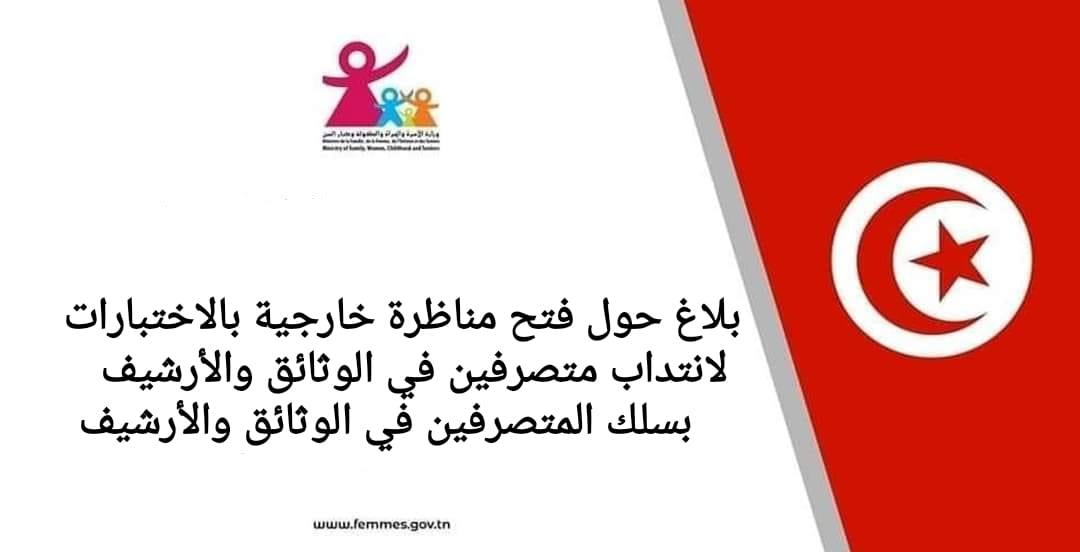 تعتزم وزارة الأسرة والمرأة والطفولة وكبار السنّ فتح مناظرة خارجية بالاختبارات لانتداب متصرفين في الوثائق والأرشيف بسلك المتصرفين في الوثائق والأرشيف وذلك طبقا للشروط والإجراءات المبينة بالبلاغ المرفق: