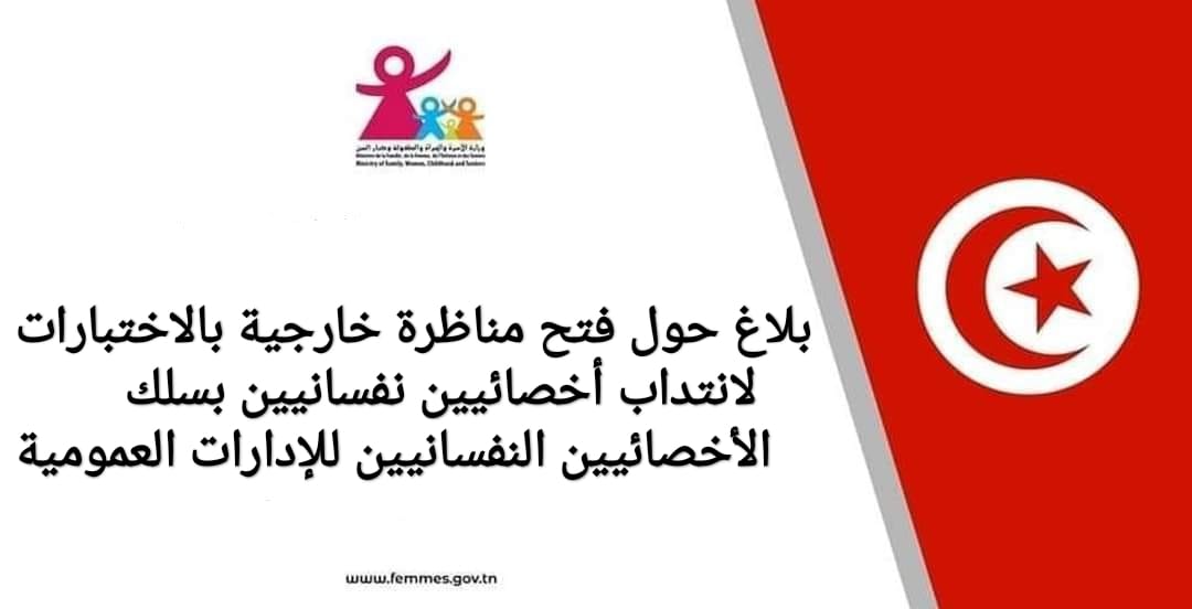 تعتزم وزارة الأسرة والمرأة والطفولة وكبار السنّ فتح مناظرة خارجية بالاختبارات لانتداب أخصائيين نفسانيين بسلك الأخصائيين النفسانيين للإدارات العمومية وذلك طبقا للشروط والإجراءات المبينة بالبلاغ المرفق: