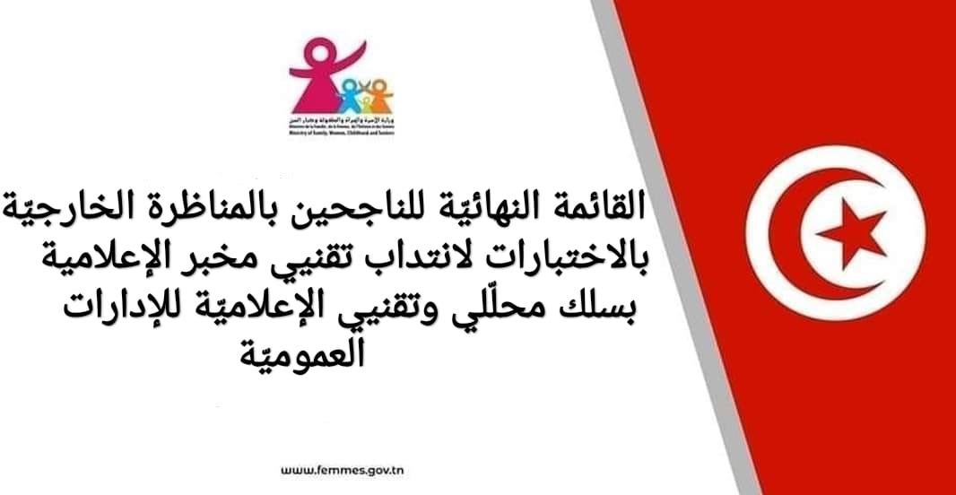 في ما يلي القائمة النهائيّة للناجحين بالمناظرة الخارجيّة بالاختبارات لانتداب تقنيي مخبر الإعلامية بسلك محلّلي وتقنيي الإعلاميّة للإدارات العموميّة.