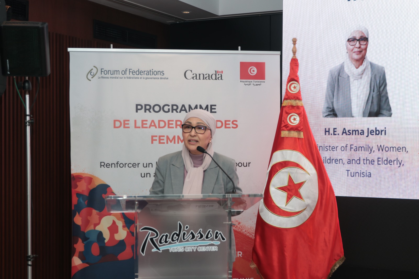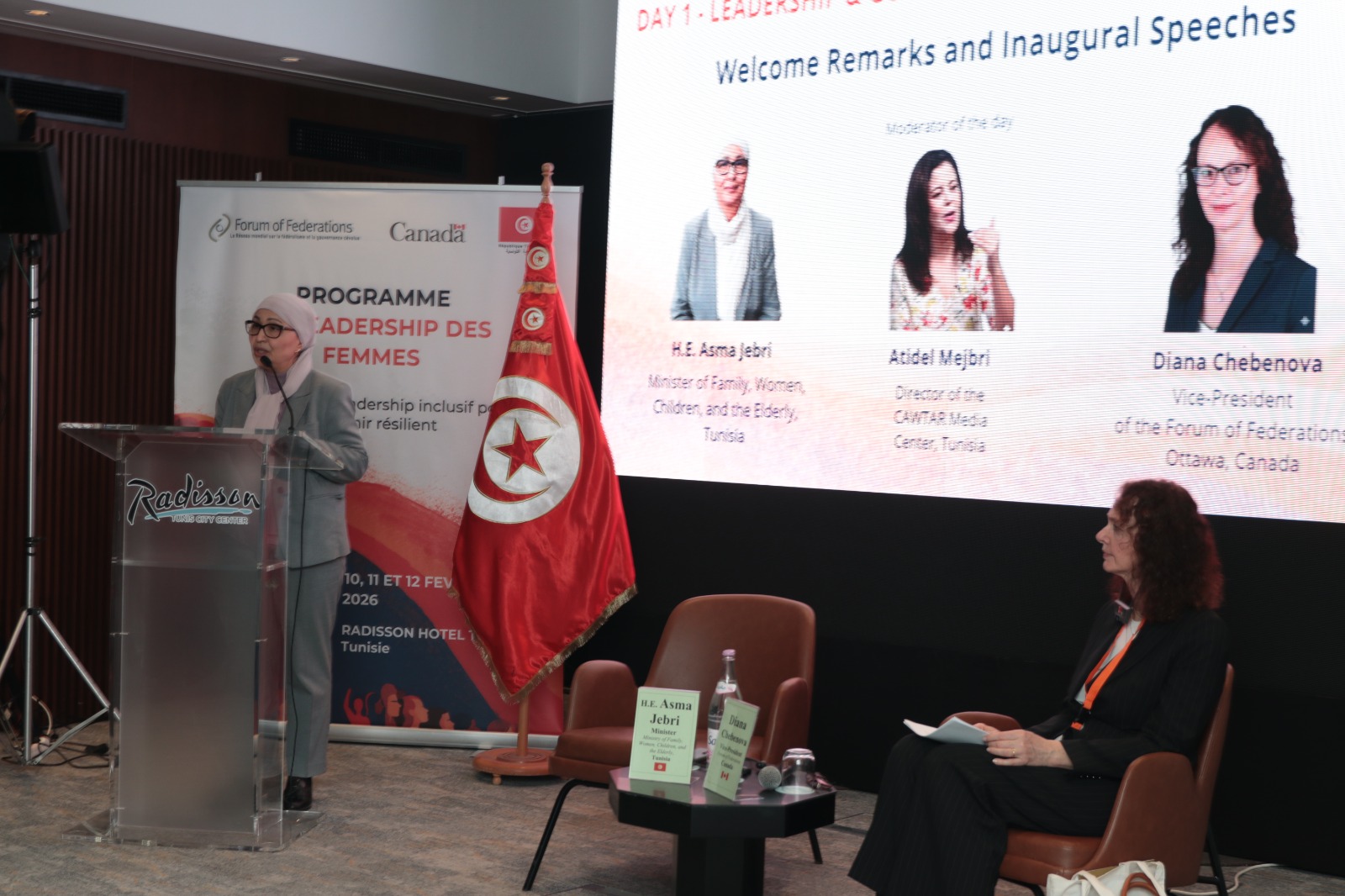 وأكّدت الوزيرة بحضور السيدة ديانا شيبونوفا Diana Chebebova نائبة رئيس منظمة منتدى الفيداراليات بكندا، أنّ المرأة التونسيّة متألقة في كلّ المجالات وفاعل أساسيّ في الشأن العام بمختلف أوجهه السياسية والاقتصادية والاجتماعية والثقافية والرياضيّة وهي نتاج لفكر داعم لحقوق النّساء ورؤية استراتيجيّة متجذّرة ومناصرة لتكافؤ الفرص بين المرأة والرجل، وإيمان وطنيّ جامع بالدور المحوري للمرأة في جميع القطاعات ومسارات التنمية الشاملة.