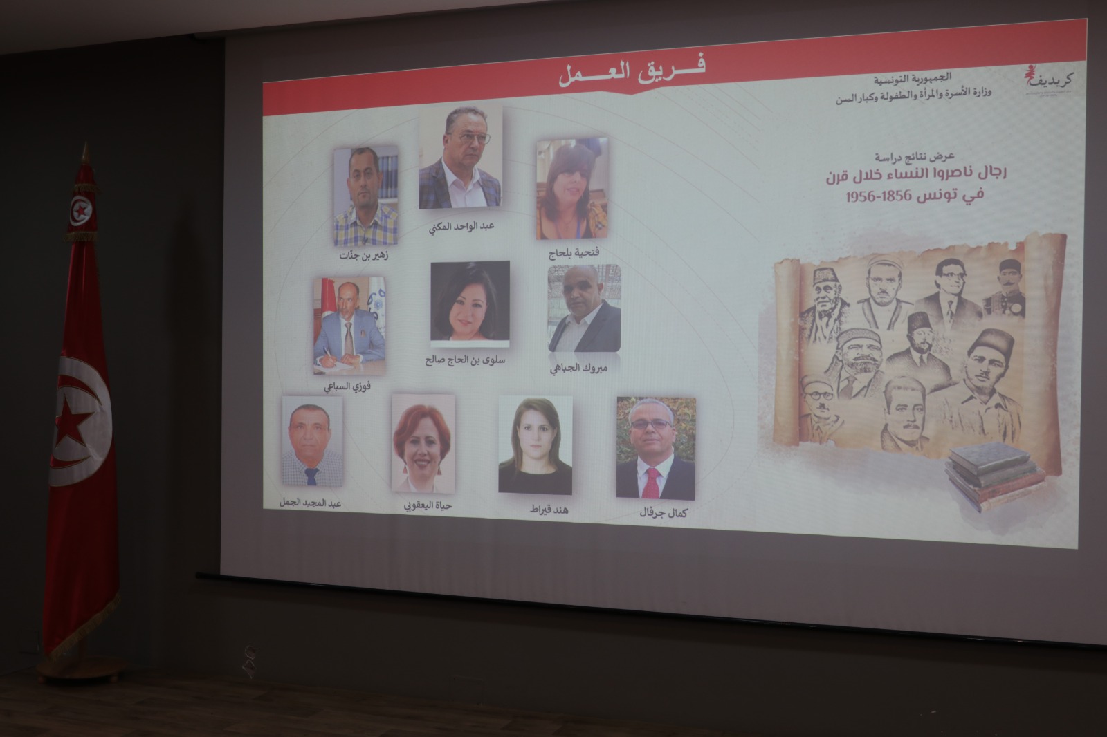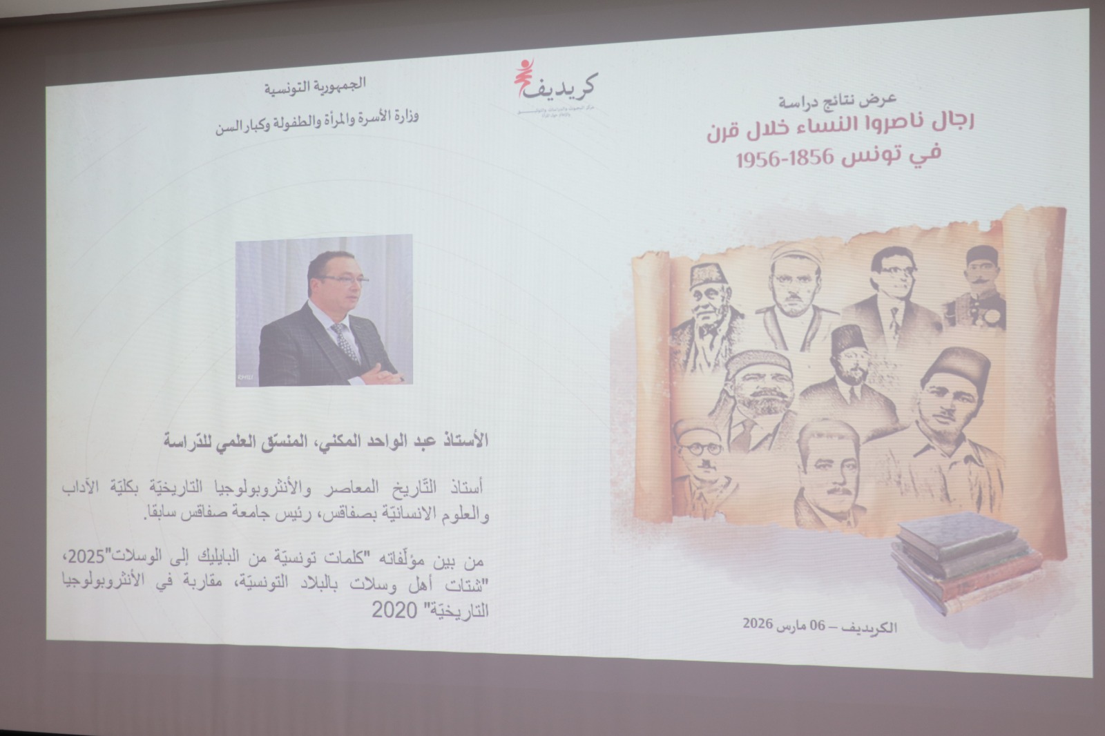 في إطار الاحتفاء باليوم العالمي للمرأة، افتتحت السيّدة أسماء الجابري، وزيرة الأسرة والمرأة والطفولة وكبار السنّ، ليلة الجمعة 6 مارس 2026، لقاء فكريّا علميّا خصّص لتقديم نتائج دراسة "رجال ناصروا النّساء في تونس خلال قرن 1856-1956"، الذي نظمه بمقرّه مركز البحوث والدراسات والتوثيق والإعلام حول المرأة "كريديف"، وذلك بحضور لجنة القيادة العلميّة للدراسة وممثلي/ات الهياكل العمومية وأعضاء الجمعيّة التونسية لعصاميّي الفنّ التشكيلي.